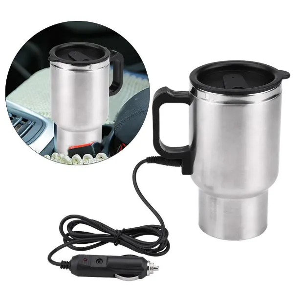 450ml 12V Stainless Steel Electric Car Cup Travel Heating Cup Electric Thermos Plug Kettles Boiling Car Coffee Mug Heater with Adapter